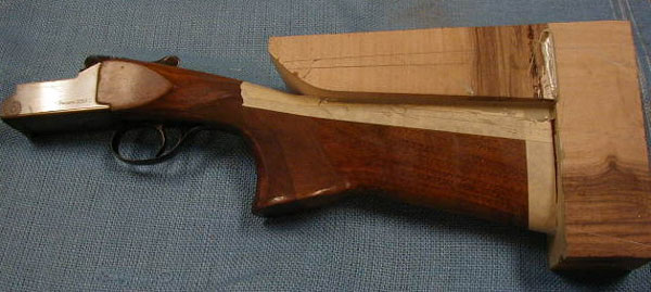 Below are a series of pictures showing the repair and modification process of a stock that was 2 1/2" too short and 3/4" too low.