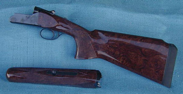 We added wood to make a custom stock with offset comb and 5/16” toe out. Then we completely refinished it in a dark burl wood film overlay.